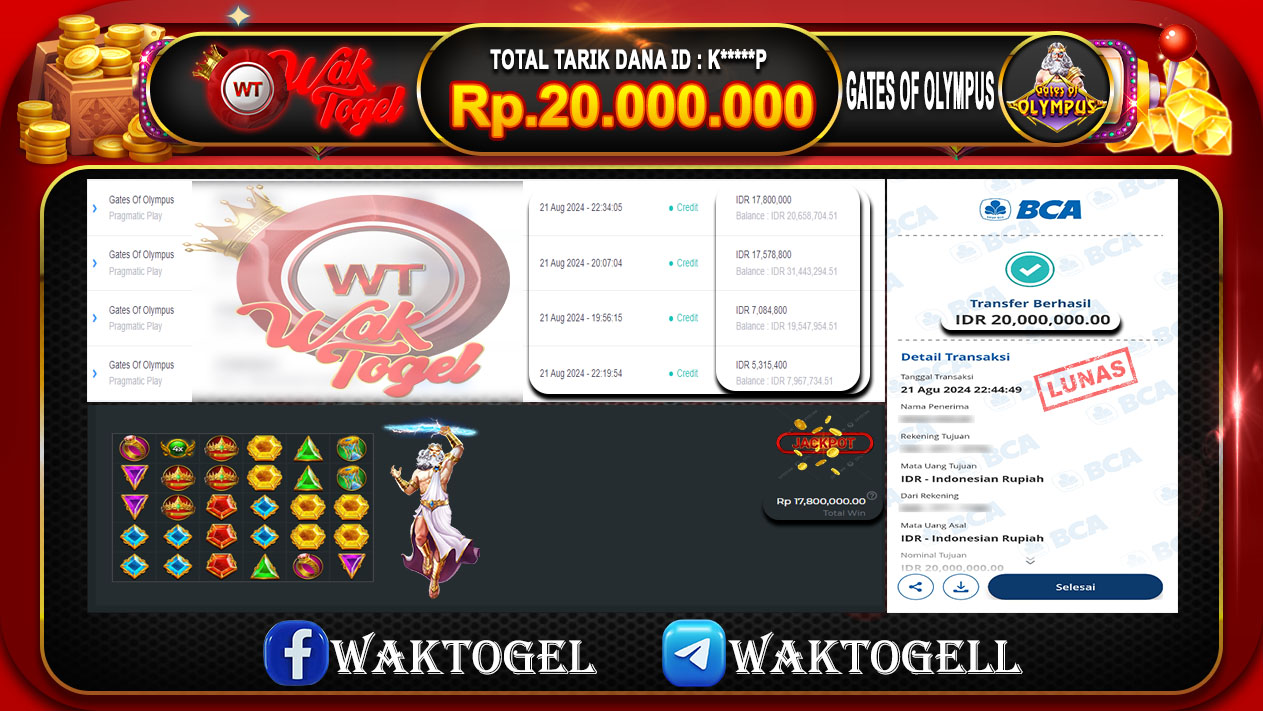 BUKTI PEMBAYARAN SLOT WAKTOGEL RP. 20.000.000 – GAME : SLOT GATES OF OLYMPUS (USER ID : K*****P) TANGGAL |21-08-2024| CASH LUNAS !