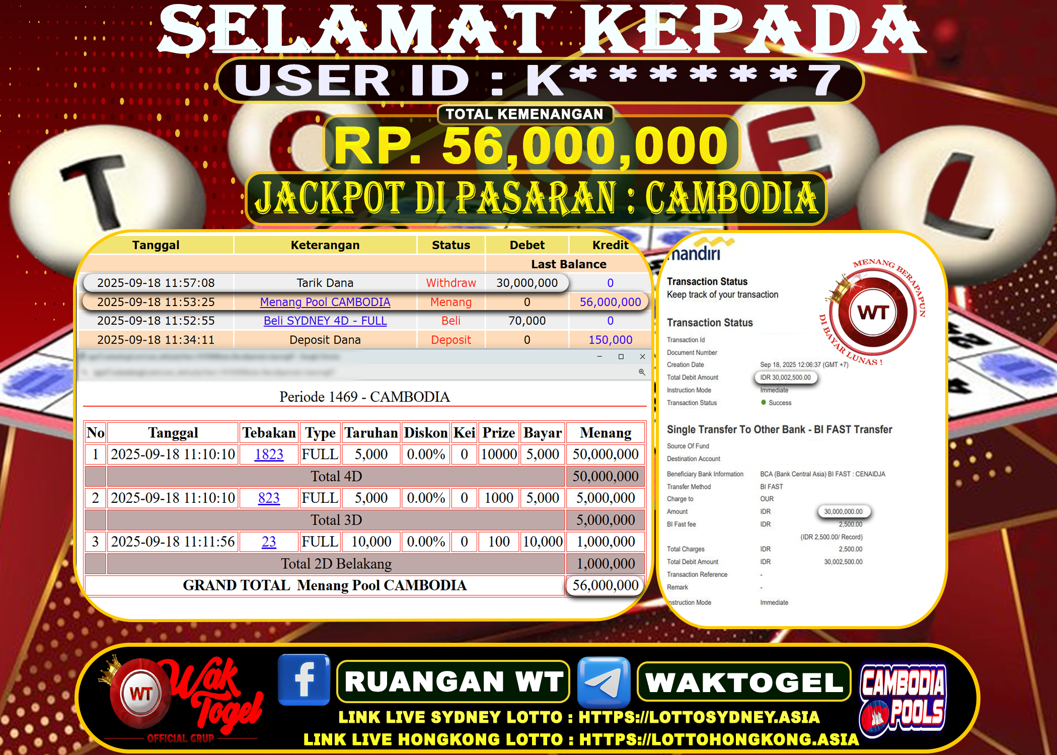 JACKPOT TOGEL WAKTOGEL BUKTI PEMBAYARAN CAMBODIA WAKTOGEL By JPWT September 18, 2025 0 comments 2 min read BUKTI PEMBAYARAN CAMBODIA WAKTOGEL BUKTI PEMBAYARAN CAMBODIA WAKTOGEL RP. 56,000,000 – GAME : TOGEL CAMBODIA POOLS (USER ID : K******7) TANGGAL |18-09-2025| CASH LUNAS! Kami […]