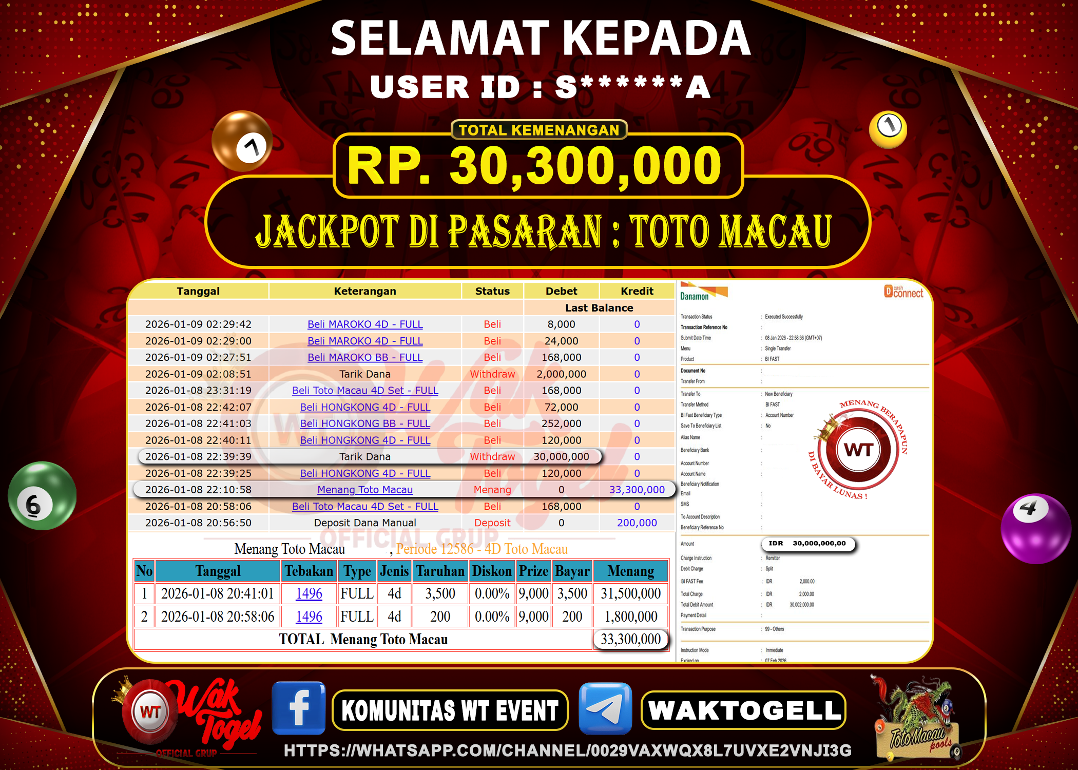 BUKTI PEMBAYARAN TOTO MACAU WAKTOGEL BUKTI PEMBAYARAN TOTO MACAU WAKTOGEL RP. 54,500,000 – GAME : TOGEL TOTO MACAU POOLS (USER ID : S******8) TANGGAL |04-01-2026| […]